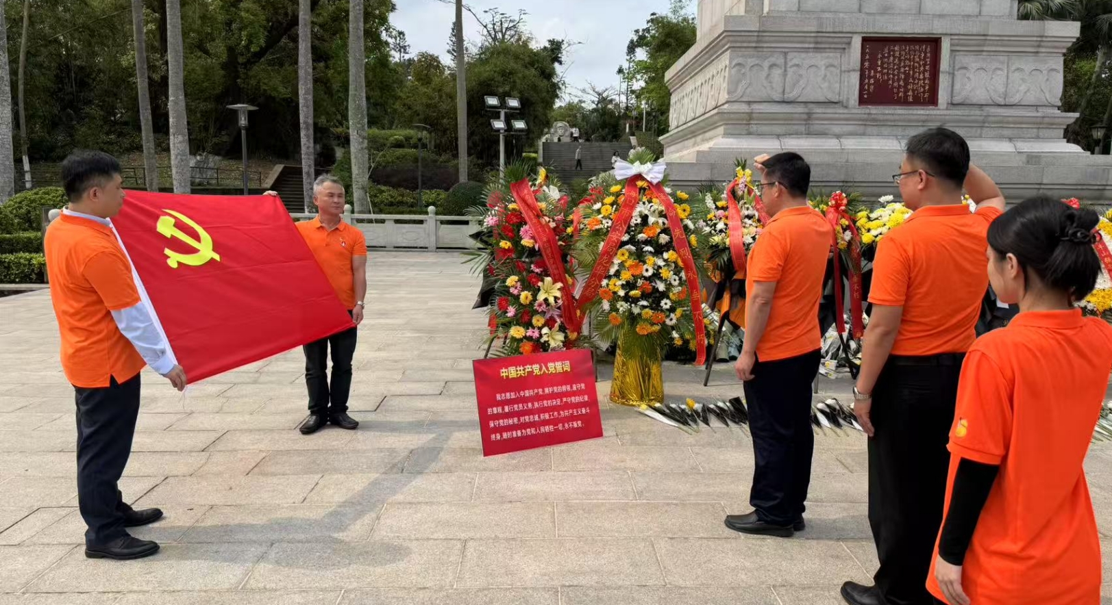 接下来,全体党员在纪念碑前,面向党旗重温入党誓词,“……为共产主义奋斗终身,随时准备为党和人民牺牲一切,永不叛党!”的誓言在广场上空回响。